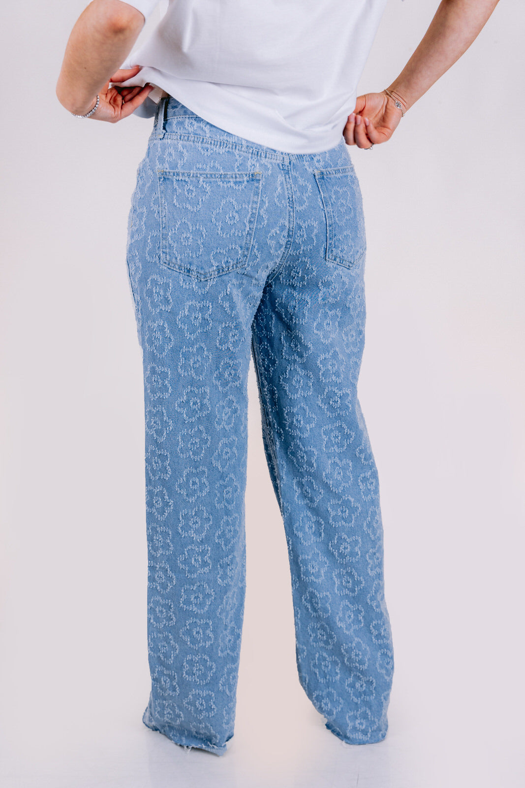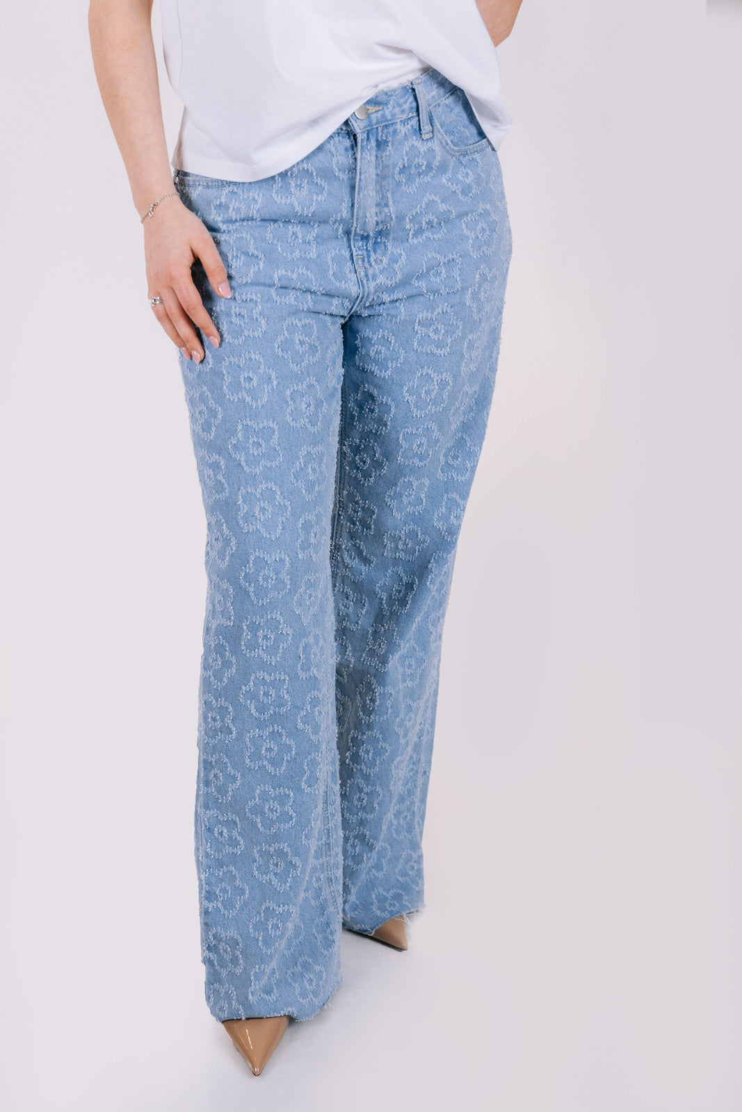 These light blue jeans feature a relaxed wide-leg silhouette and delicate floral details that bring a fresh, feminine touch. Effortlessly blending laid-back California cool with playful charm, they’re perfect for sunny days, strolls through the city, or dressing up with heels for an elevated look.